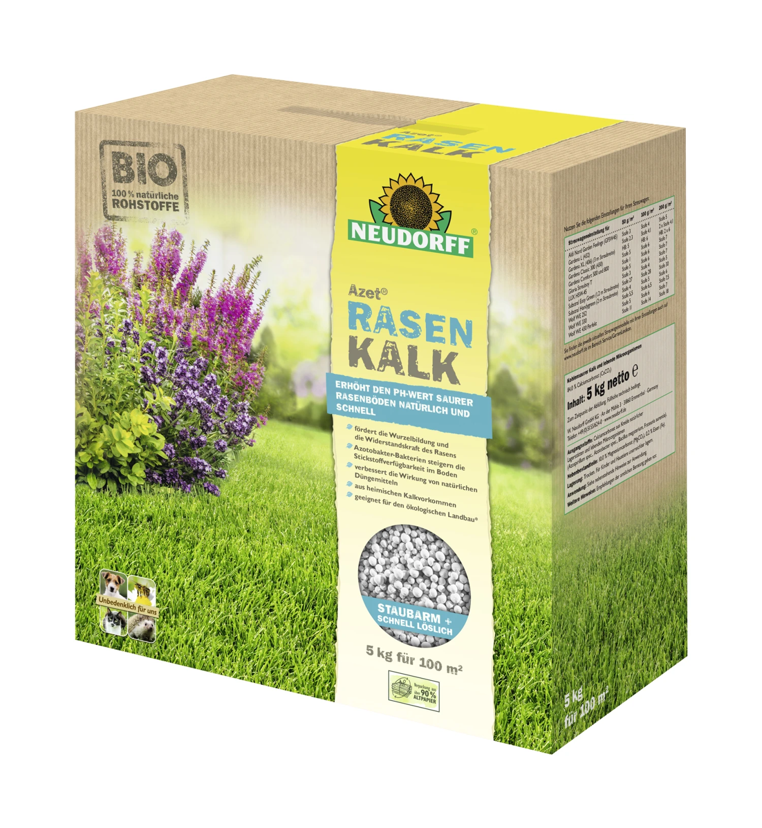 – Kohlensauerer Kalk (84 % CaCO3 und 10 % MgCO3) mit Eisen und lebenden Azotobacter Bodenbakterien.