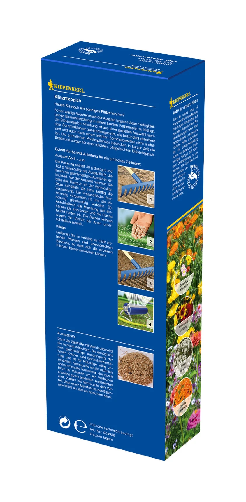 Pflegeleichte Dauerblüher, die den Garten in einen bunten Blütenteppich verwandeln. Schon wenige Wochen nach der Aussaat beginnt diese niedrigbleibende Blumenmischung in einem bunten Farbenspiel zu blühen. Die Blütenteppich-Mischung ist aus einer gezielten Auswahl niedriger Sommerblumen zusammengesetzt, die besonders standfest sind und auch nach einem leichten Sommergewitter nicht umfallen. Die enthaltenen Polsterpflanzen bedecken in kurzer Zeit die Beete und sorgen für einen dichten, pflegeleichten Blütenteppich. Unsere speziellen und vielseitigen Blumenmischungen bestehen aus 40 g hochwertigem Blumensaatgut und 100 g Aussaathilfe.