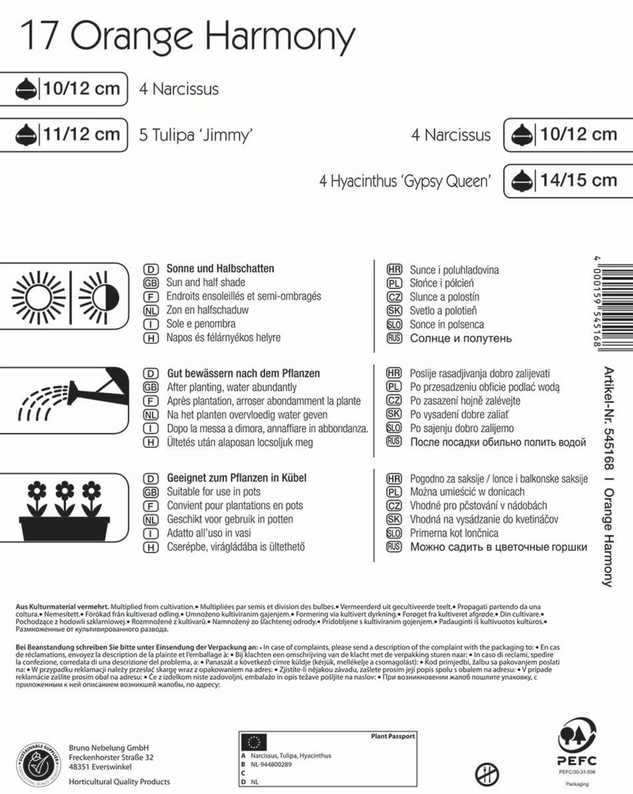 Die farbenprächtige Mischung Colour Symphony „Orange Harmony“ setzt sich zusammen aus Narzissen, Tulpen und Hyazinthen. Zarte orange, rosafarbene, weiße und gelbe Farbtöne erschaffen eine angenehme Atmosphäre in Beet und Kübel. Lassen auch Sie sich von den 30 bis 45 cm hohen Schönheiten verzaubern, die im April und Mai in traumhafter Blüte stehen. Sie fühlen sich an sonnigen oder halbschattigen Standorten besonders wohl, können aber auch problemlos geschnitten und in die Vase gestellt werden, wo sie sehr lange haltbar sind.