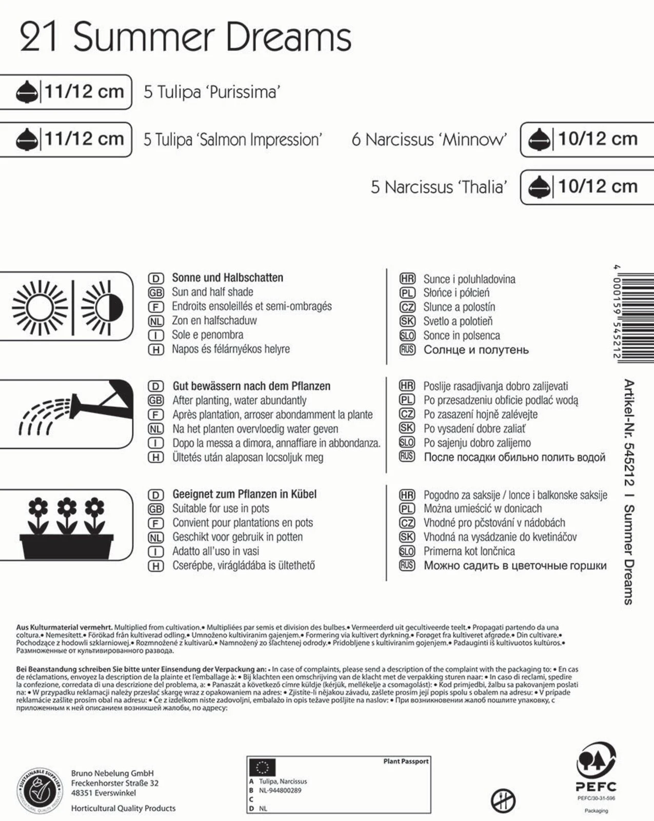 Die Blumenzwiebelmischung Colour Symphony „Summer Dreams“ von Kiepenkerl ist ein trendiger Mix aus der weißen Tulpe ‚Purissima‘, der gelben Narzisse ‚Minnow‘, der rosafarbenen Tulpe ‚Salmon Impression‘ und der weißen Narzisse ‚Thalia‘. Die Blütezeit dieser Sorten fällt in die Monate April und Mai. In dieser Zeit versprühen sie in Beeten oder auch in Pflanzgefäßen einen besonders zarten, äußerst attraktiven Glanz. Die winterharten und mehrjährigen Pflanzen erreichen Wuchshöhen zwischen 25 und 45 cm und eignen sich hervorragend für die Verwilderung.