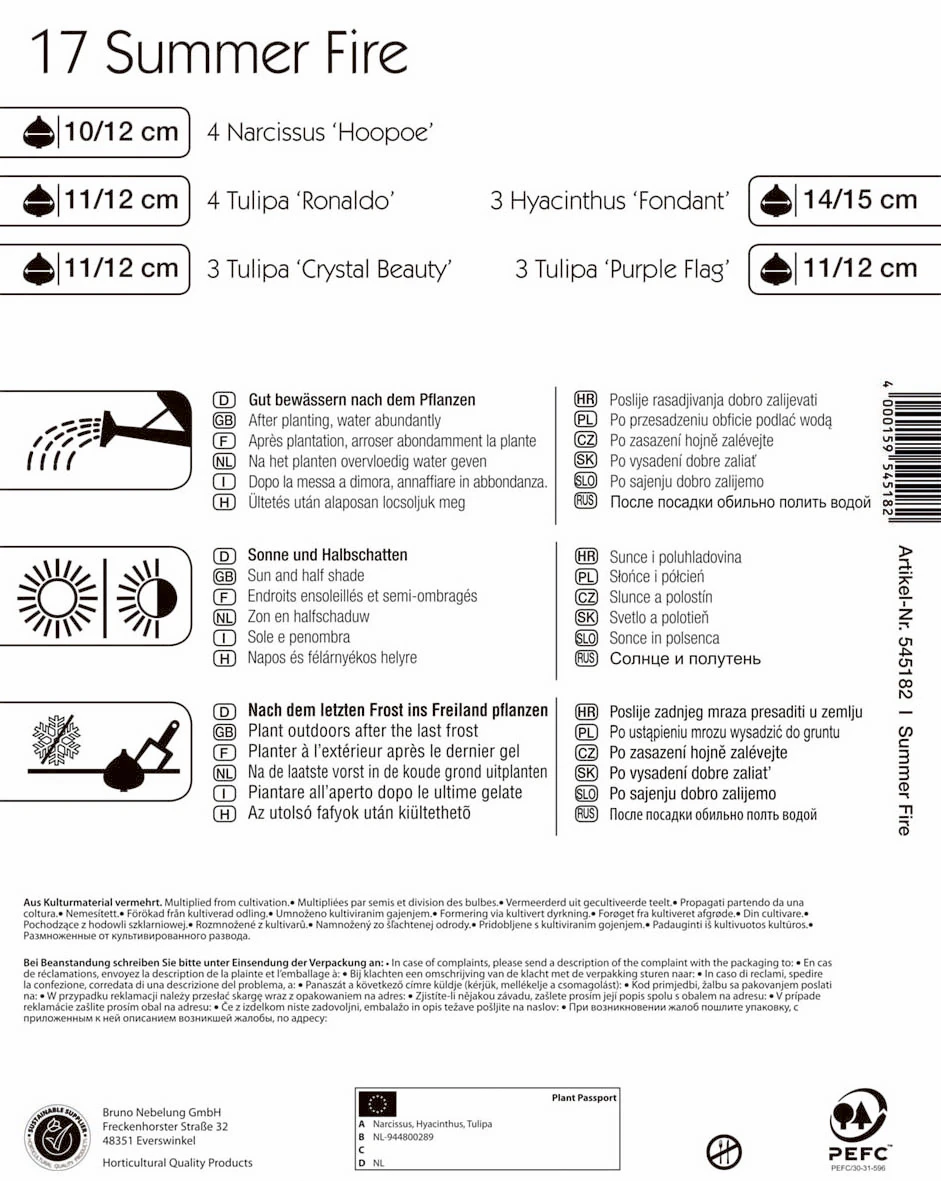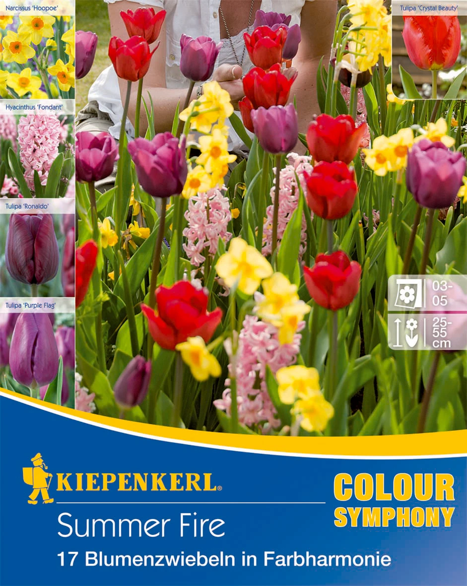 Die Blumenzwiebelmischung Colour Symphony „Summer Fire“ ist eine bunte Parade farblich aufeinander abgestimmter Frühjahrsblüher. Enthalten sind die gelbe Narzisse ‚Hoopoe‘, die rosafarbene Hyazinthe ‚Fondant‘ sowie die Tulpen ‚Ronaldo‘, ‚Purple Flag‘ und ‚Crystal Beauty‘ in den Farben Lila, Purpur bzw. Rot. Die Blütezeit dieser 5 winterharten und mehrjährigen Sorten fällt in die Monate März bis Mai. Die formschönen Blüten sitzen dann an 25 bis 55 cm hohen Stängeln und leuchten aus Beeten oder Pflanzgefäßen in voller Pracht hervor. Für die Verwilderung ist diese Mischung bestens geeignet.