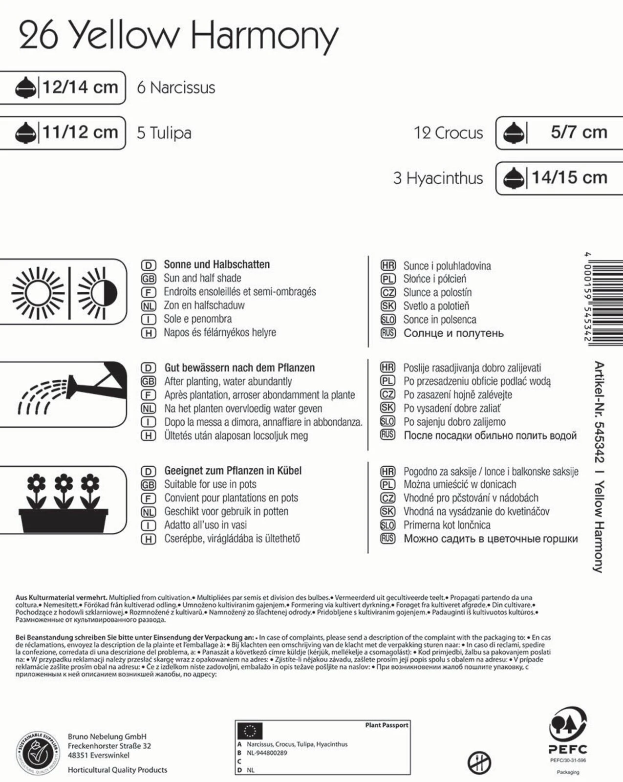 Die Blumenzwiebelmischung Colour Symphony „Yellow Harmony“ ist eine farblich aufeinander abgestimmte Auswahl an gelb blühenden Narzissen, Krokussen, Tulpen und Hyazinthen. Da sich die formschönen und duftenden Blüten zu unterschiedlichen Zeiten zeigen, fällt der Blütezeitraum sehr lang aus und reicht von Februar bis in den Mai hinein. Die Pflanzen werden 10 bis 45 cm hoch und eignen sich damit auch für die Kultur in Kübeln, Kästen und Hochbeeten. Nach dem Pflanzen sollten die Zwiebeln gut gewässert werden. In sonnigen und halbschattigen Lagen fühlen sich die mehrjährigen Pflanzen besonders wohl und verwildern mit der Zeit, sofern dies gewünscht ist.