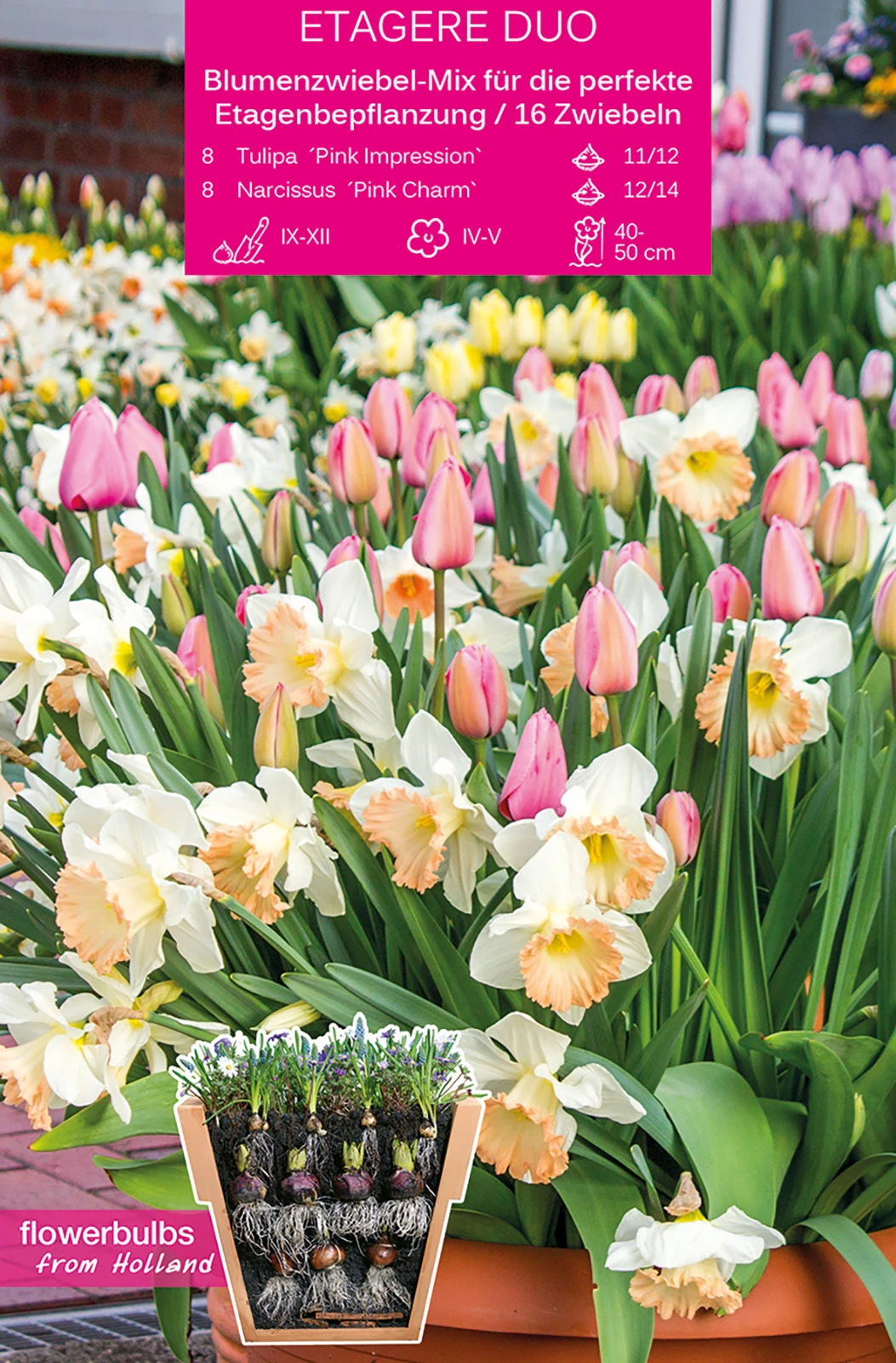 Pflanzen Sie die Blumenzwiebeln einfach in mehreren Schichten in einen Kübel nach der bewährten Etagen- oder Lasagnemethode. Wir haben für Sie die passenden Sorten zusammengestellt. Hier werden mehrere Arten bzw. Sorten, die nacheinander blühen in Schichten übereinander angeordnet. Dabei werden frühblühende Zwiebeln als obere Schicht und die später und ganz spät blühenden Zwiebeln in die mittlere und unterste Schicht gepflanzt. Beim Setzen der Zwiebeln, sollten Sie darauf achten, dass diese nicht direkt übereinanderliegen. Die Blumenzwiebeln sind einzeln verpackt und beschriftet, sodass die Bepflanzung zu Hause ganz einfach nachgemacht werden kann.