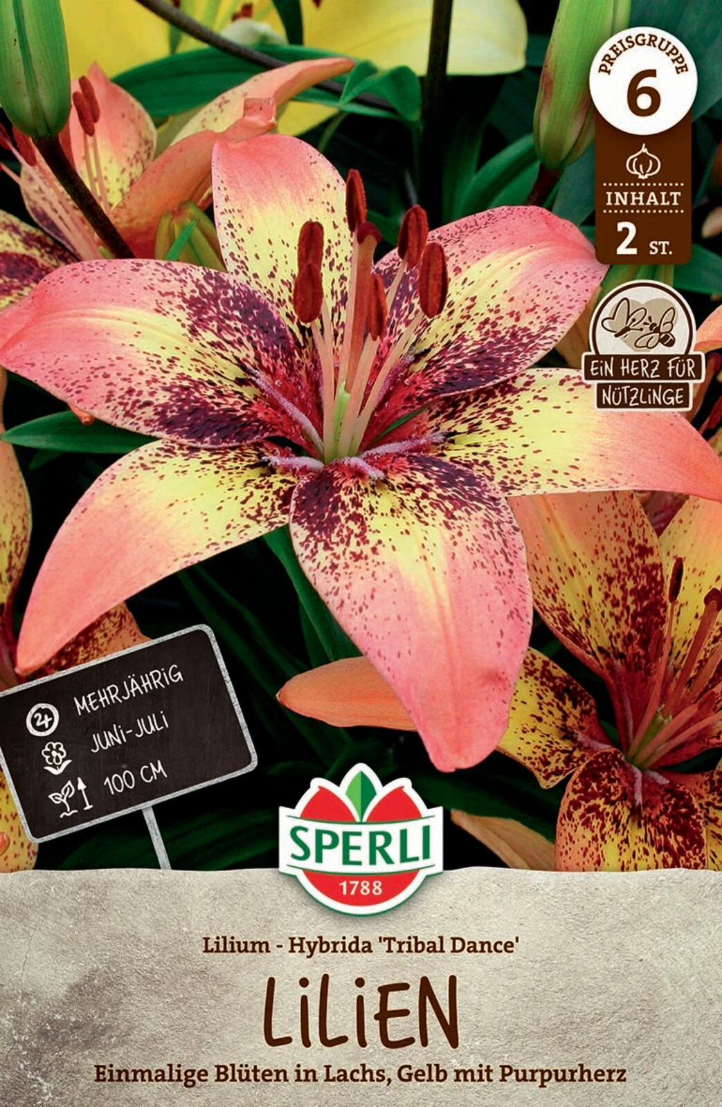 Die zweifarbige Lilie ‚Tribal Dance‘ fasziniert durch ihre spannende Farbkombination aus lachsfarbenen Blütenblättern und purpurnen Tupfen. Die gelbe Mitte bietet einen zusätzlichen Kontrast. Die aufrecht wachsenden Blüten erlauben Dir den direkten Blick in die Blüte, anders als bei hängenden Blüten. So kannst Du jederzeit die ganze Schönheit dieser Lilie bestaunen! Für Nützlinge wie Bienen und Hummeln enthält die Sorte wertvolle Insektennahrung. Dadurch, dass sie nicht duftend ist, ist sie auch für Lilienliebhaber geeignet, die eine Sorte mit weniger starkem Duft suchen. Im Juni und Juli hat sie ihre Höhe von 100 cm erreicht und schenkt Dir viele Blüten. Diese kannst Du schneiden und mit den haltbaren Blüten Deine vier Wände verschönern. ‚Tribal Dance‘ erlaubt einen leichten Anbau im Garten und wird Dir so viel Freude bereiten.