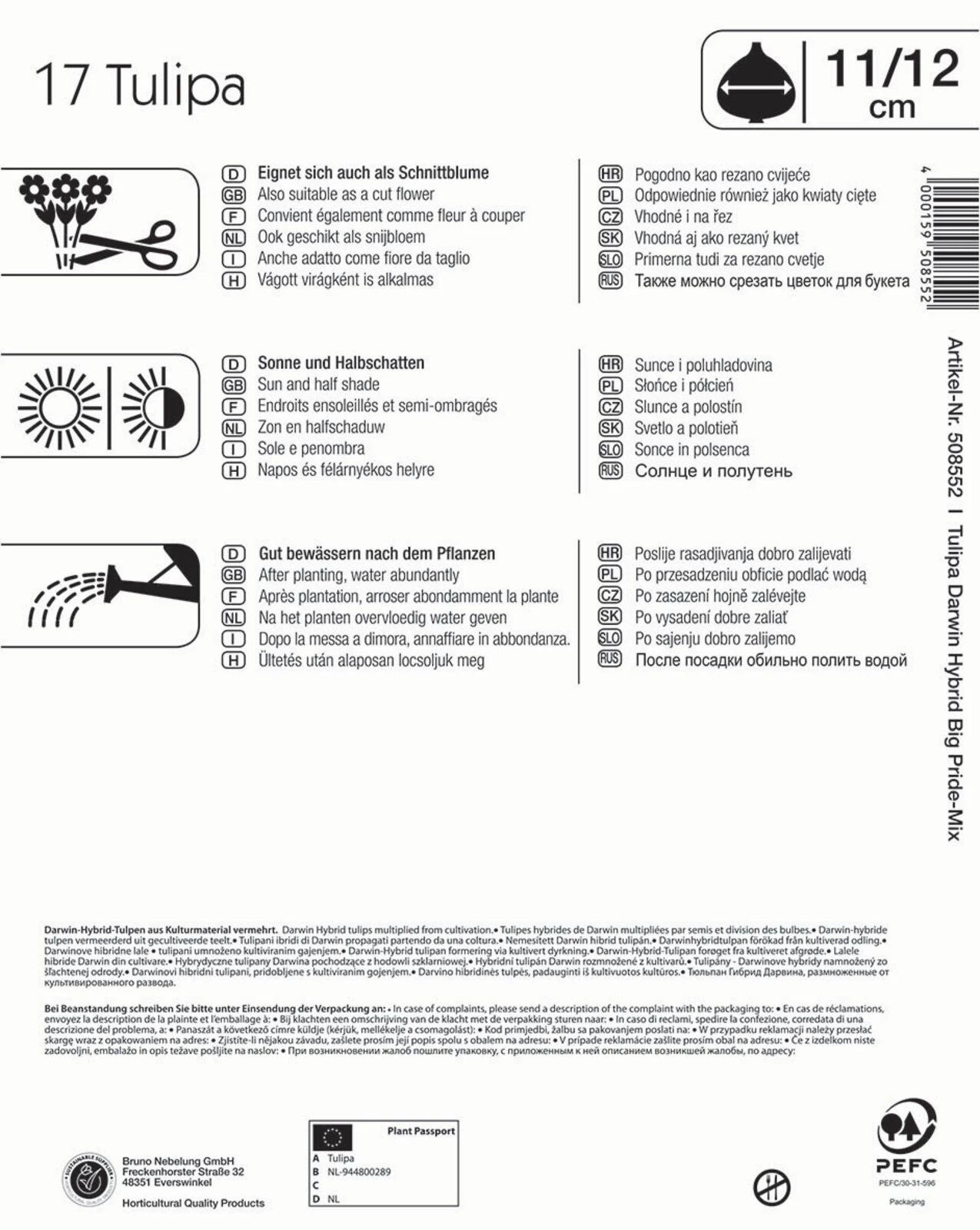 Das Mega-Pack „Darwin-Hybrid-Tulpe ‚Big Pride‘ Mischung“ macht seinem Namen alle Ehre! Es enthält eine farblich perfekt abgestimmte Auswahl an rosafarbenen, roten und violetten Tulpen, die oft auch zweifarbig erblühen. Mit dieser Mischung holen Sie sich wirklich ein farbliches Highlight in den Garten oder ins Haus, denn die Tulpen eignen sich bestens für den Vasenschnitt. Sie erreichen eine stattliche Höhe von bis zu 60 cm und blühen zwischen April und Mai.