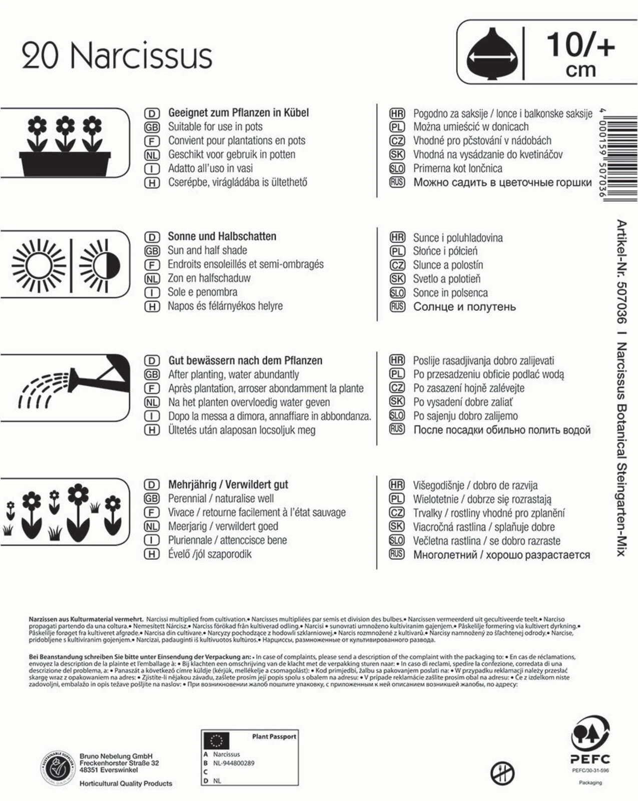 Narzissen können auch auf dem Balkon gepflanzt werden mit dem Mega-Pack „Steingarten Narzissen Mischung“. Die Blumen in dieser Mischung erreichen lediglich eine Wuchshöhe von 25 cm und sind damit bestens für eine Pflanzung in Kübel geeignet. Die Auswahl an verschiedenfarbigen und verschiedenförmigen Narzissen ist perfekt abgestimmt und sorgt für ein schönes Blumenbeet. Die Blütezeit beginnt im März und zieht sich bis in den April hinein. Bei einer Pflanzung im Garten ist es zudem möglich, dass die Narzissen verwildern.