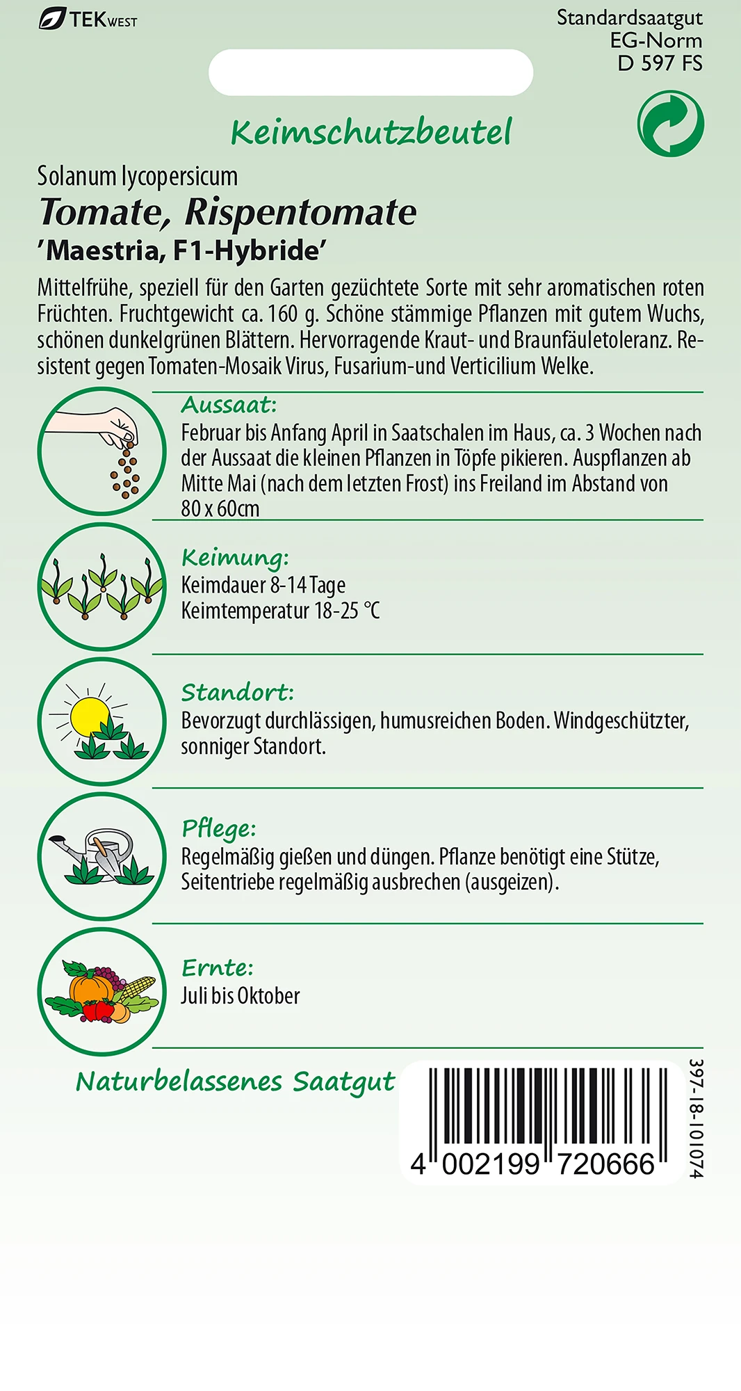 Mittelfrühe, speziell für den Garten gezüchtete Sorte mit sehr aromatischen roten Früchten. Fruchtgewicht ca. 160g. Schöne stämmige Pflanzen mit gutem Wuchs, schönen dunkelgrünen Blättern. Hervorragende Kraut – ,Braun -, und Fäuletoleranz. Resistent gegen Tomaten – Mosaik Virus, Fusarium – und Verticilium Welke.