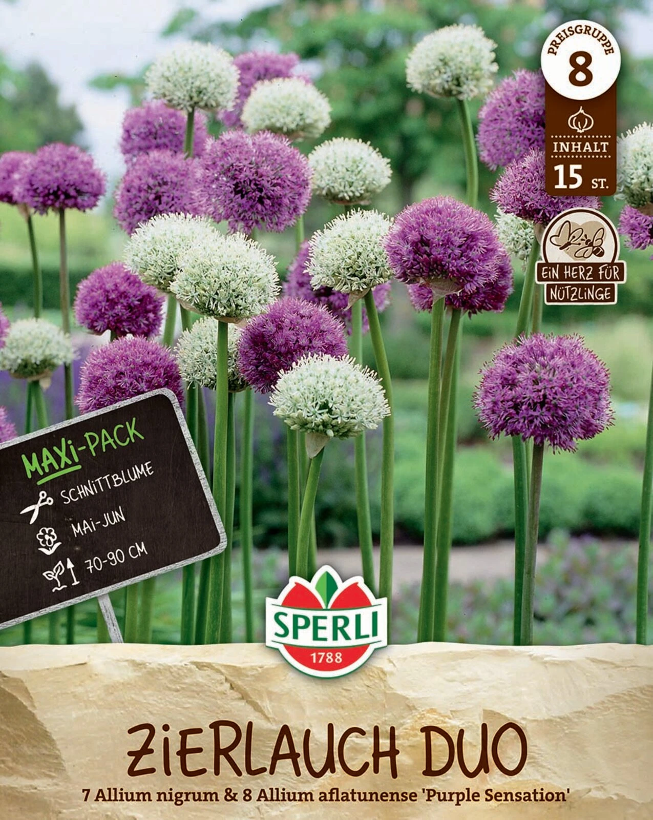 Allium – Kombination aus attraktiven purpurvioletten und weissen Blütenbällen, die besonders in Staudenbeeten für Aufsehen sorgen. Trocken und luftig lagern. Allium nigrum und Allium aflatunense Purple Sensation